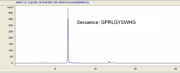 En Marzo de 2012 se instalo un sintetizador de Peptidos Modelo Tribute en los Laboratorios del Instituto de Bioquimica de la Universidad Austral de Chile en una inversion cercana a los USD 130.000 . Durante la Instalacion se realizo un Test de Validacion sintetizando un Peptido de Prueba de 10 Mer en escala de 0.1 mmol, obteniendose aproximadamente 150 mg del Peptido en alta pureza en un tiempo de 6 horas. El peptido obtenido fue pasado por un HPLC obteniendose el cromatograma inferior, lo cual demuestra la alta eficiencia del sintetizador Modelo Tribute. En este sistema se pueden sintetizar peptidos de hasta 101 mer sin intervencion alguna en el equipo.